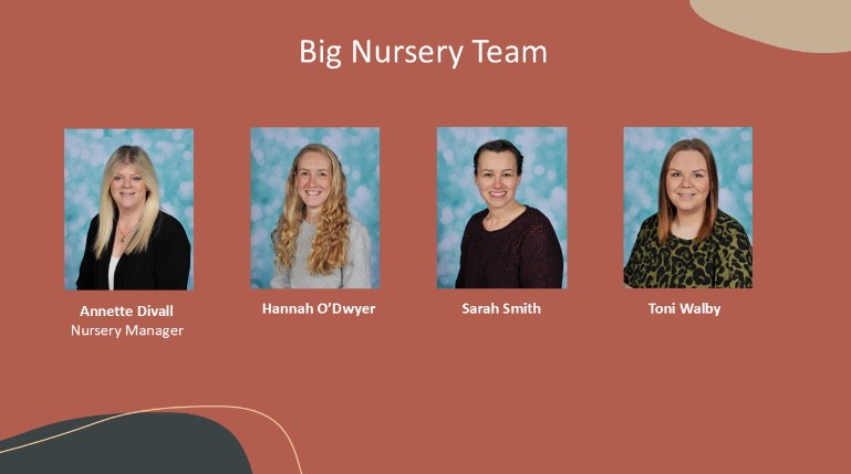Our 3-4 year olds learn and explore in our 'Big Nursery' environment and is run by our expert practitioners: Mrs Divall (Nursery Manager), Mrs O'Dwyer, Mrs Smith and Ms Walby.