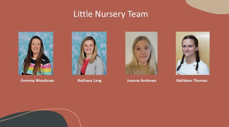 Our 'Little Nursery' provides a specialist learning environment for our 2-3 year olds and is run by our expert practitioners: Mrs Woodman, Mrs Lang, Mrs Andrews and Miss Thomas.
